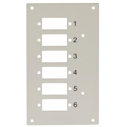 Pannello frontale per box fibra ottica I-CASE DIN-SPLICETPredisposizione per 6 connettori SC-DuplexAdattatori non inclusiColore: grigio, RAL 7035Dimensioni