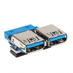 Questo adattatore USB 3.0 consente di collegare 2 periferiche USB interne, ma dotate di connettore USB per esterni(come alcuni panelli frontali), direttamente alla presa 19pin USB presente sulla scheda madre.