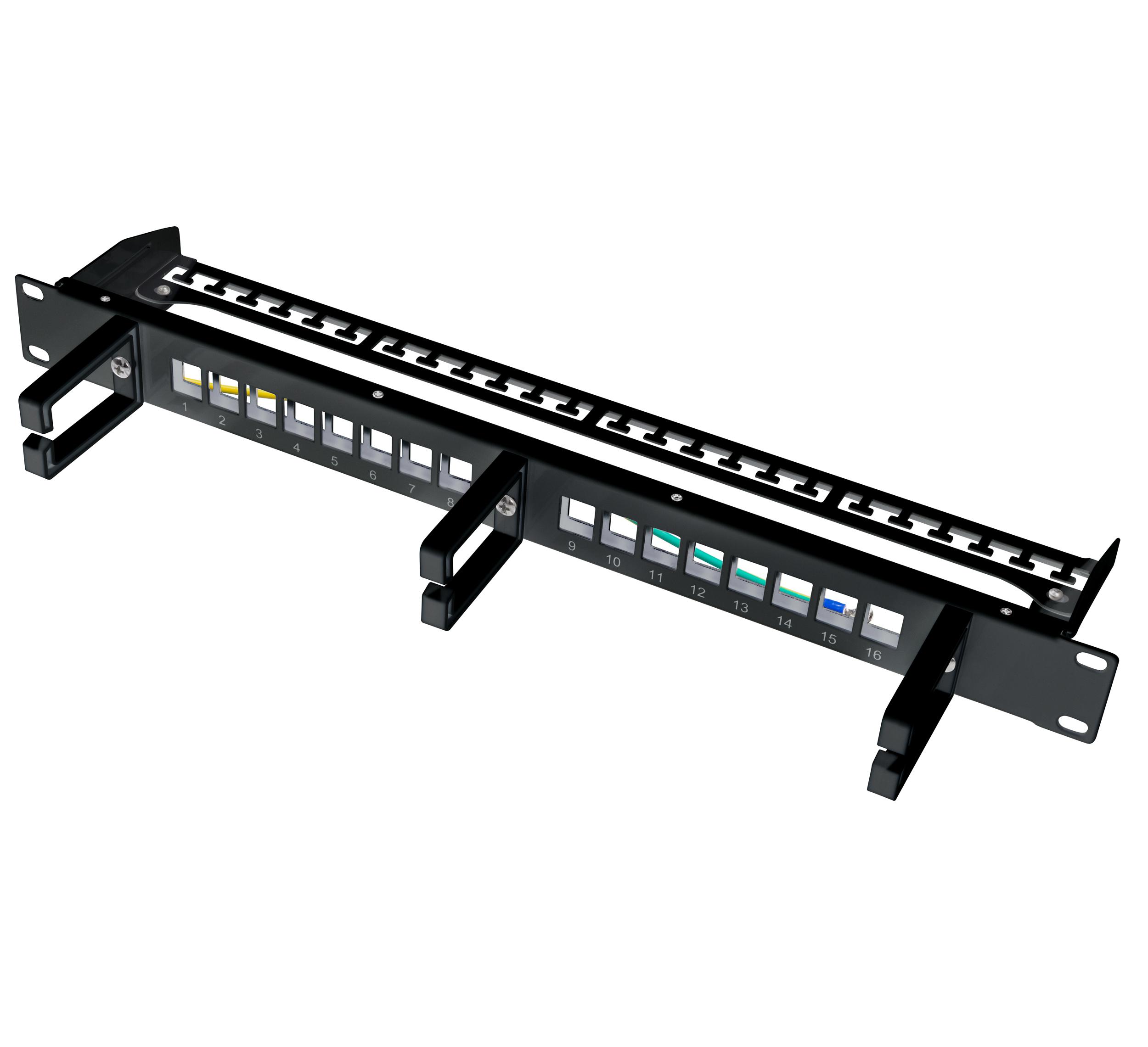 I-KS PP-16-CMB è un pannello patch con tre anelli passacavo integrati, che garantiscono un instradamento semplice e ordinato dei cavi.CaratteristichePannello patch Keystone schermatoFino a