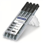 LUMOCOLOR PERMANENT IN CONFEZIONE RIGIDA STAEDTLER BOX ASSORTITA IN 4 TRATTI DI COLORE NERO S= SUPERFINE F=FINE M=MEDIO B=LARGO.