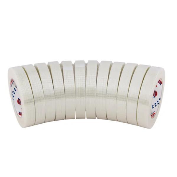 Nastro monoadesivo con supporto in BOPP rinforzato bidirezionalmente con tessuto di fibra di vetro.