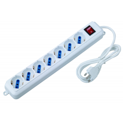 Presa multipla a 7 uscite per spine italiane e schukoPrese 10/16A bipasso/Schuko angolate a 45°Include messa a terra per ogni presaInclude interruttore luminoso di accensioneCon occhielli di