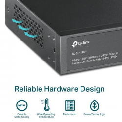 16-Port 10/100Mbps + 2-Port Gigabit Rackmount Switch with 16-Port PoE+, 16? 10/100 Mbps PoE+ Ports, 2? Gigabit Non-PoE Ports, 1? Combo Gigabit SFP Slot, 802.3at/af, 150 W PoE Power, 1U 19-inch Rack-mountable Steel Case, Extend Mode for 250 m PoE Transmitt