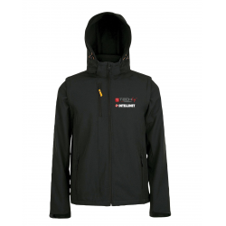 Giubbotto SoftShell in tessuto tecnico completo di cappuccio con visiera e maniche removibiliEsterno 95% poliestere, 5% elastanInterno in micropileAntivento, impermeabile e traspirante