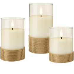 Set di 3 Candele a LED in Vera Cera Bianca in Vetro e Canapa con Timer