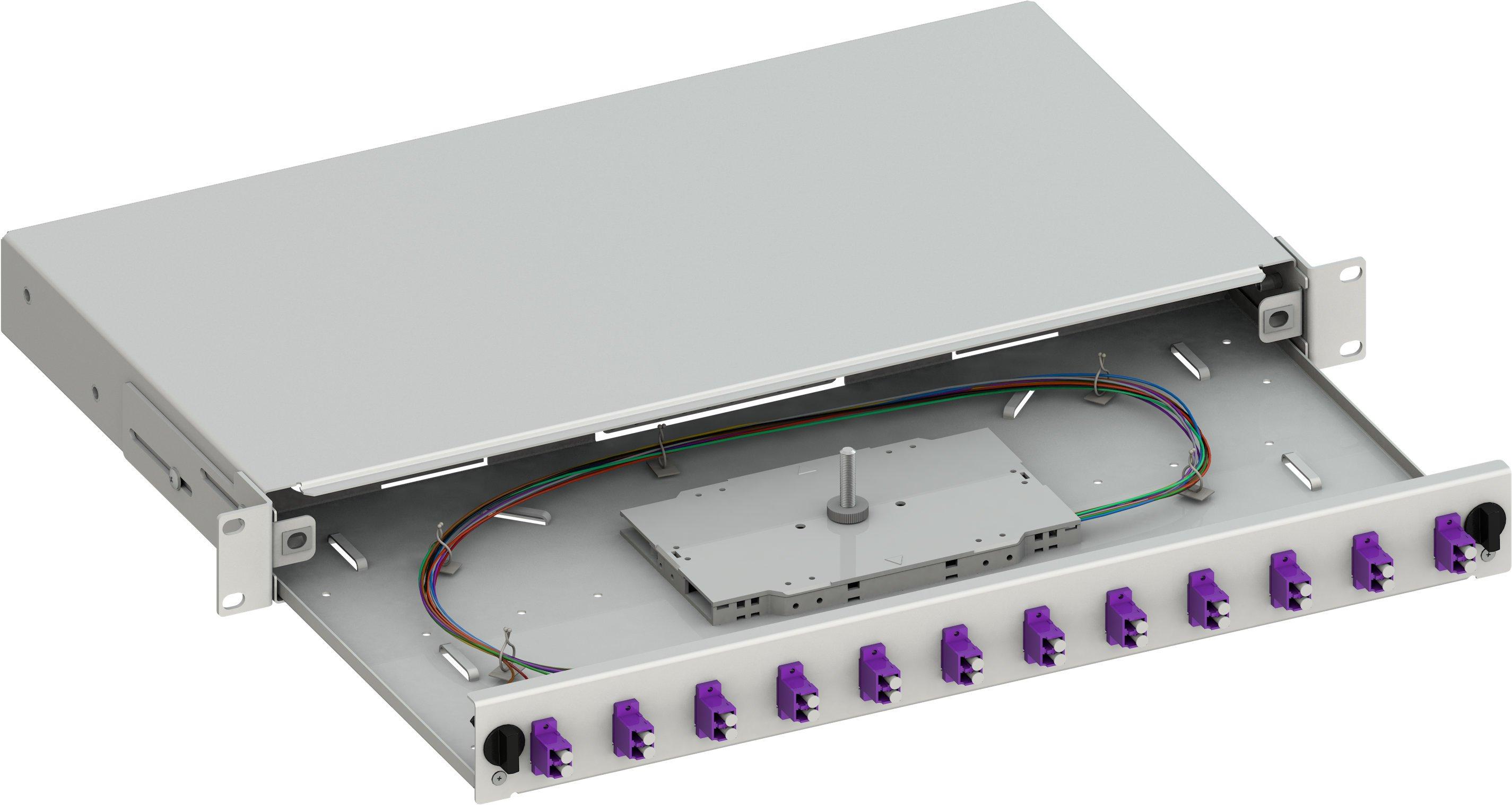 Cassetto ottico per montaggio a rack 19? 1HEBox di giunzione completamente assemblato con adattatori LC, pigtails e vassoio con coperchioInclude 12 bussole e 24 pigtails LC Duplex in fibra ottica multimodale OM4