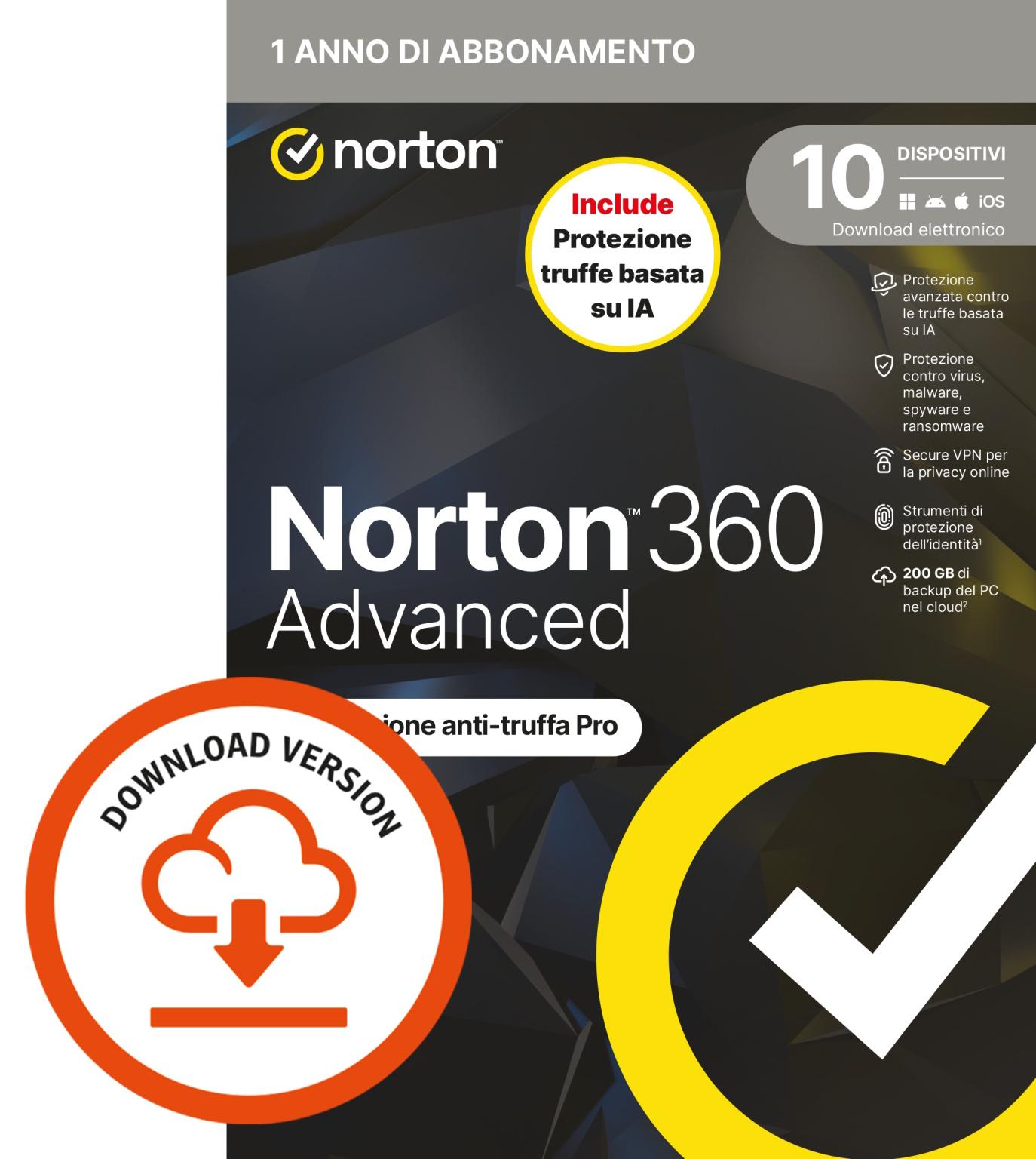 NORTON 360 ADVANCED 2026 - ANTITRUFFA- 10 DISPOSITIVI 12 MESI 200GB - IT ESD