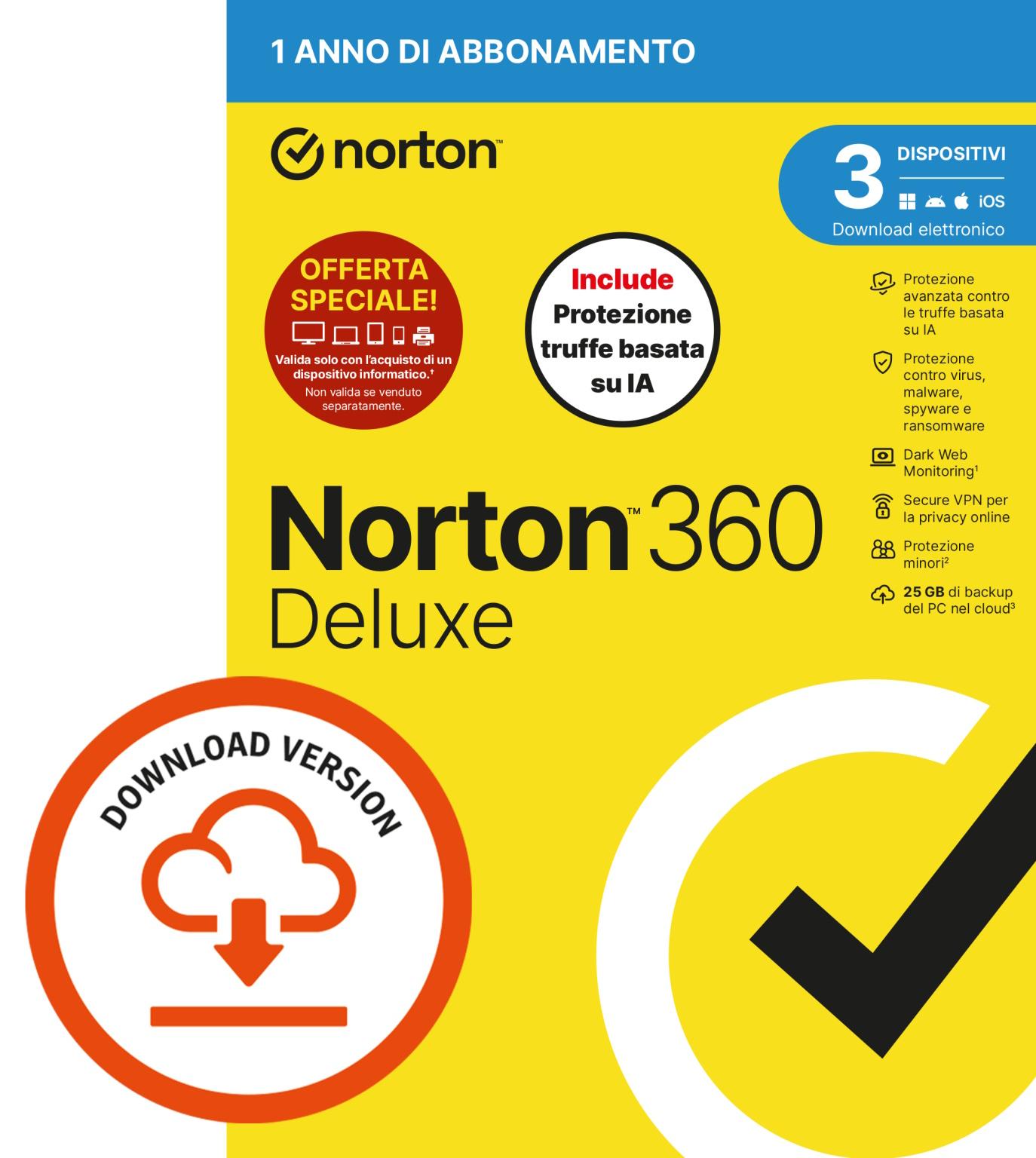 NORTON 360 DELUXE 2026 -ANTITRUFFA- ATTACH - 3 DISPOSITIVI 12 MESI 25GB - IT ESD