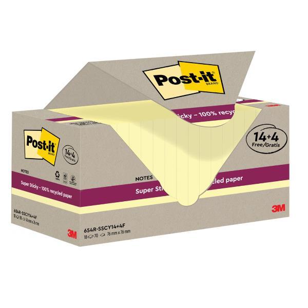 Foglietti Post-it Super Sticky 100 Riciclati Giallo Canary 76 mm x 76 mm 18 blocchetti da 70 fogli 8/ctn - 100 PEFC